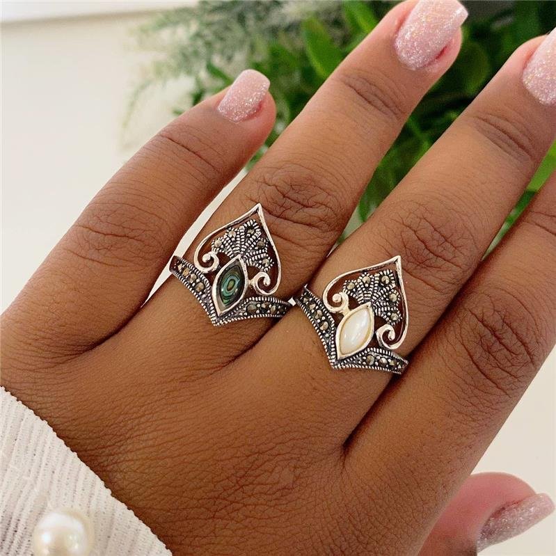 Anel Prata 925 Legitima em Bali. Anel um terço do aro trabalhado com detalhes de linhas e cravejado com pedra marcassita, bico indicado para baixo. Pedra natural no centro da peça e superior a ele bico de contorno liso, no seu interior figuras de losangos trabalhados em detalhes de linhas com pedras marcassita.Medidas: