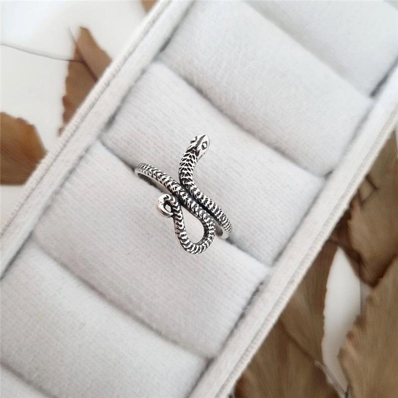 Anel Prata 925 legítima em bali. Aro formando o corpo da serpente todo trabalhado com fechamento formado pelo encontro de partes próximo a cabeça apontando para cima e do outro lado o rabo torcido em curvas. Aro na parte inferior liso.Medidas