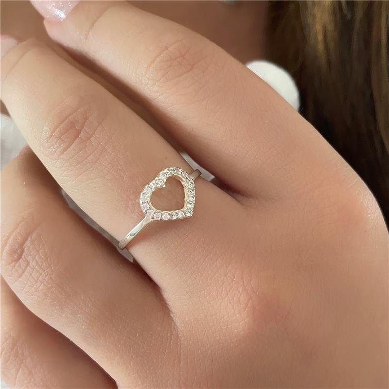 Anel de prata 925 legítima branca de coração vazado cravejado com pedras de zircônia.Medidas: