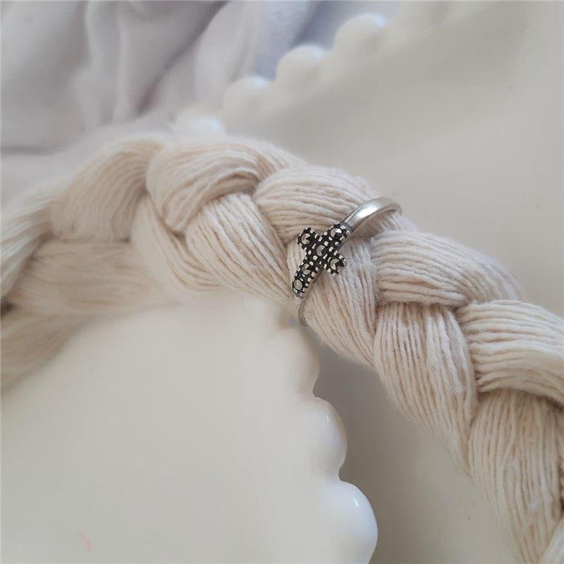 Anel Prata 925 legítima em Bali. Cruz na horizontal, seguindo a volta do anel, trabalhada com risquinhos e cravejada de pedra marcassita.Medidas:
