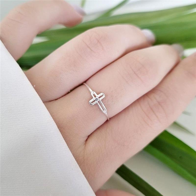 Anel Prata 925 legítima. Aro fino com cruz horizontal na parte superior, com fundo vazado e uma pedra de zircônia cravejada no centro.Medidas