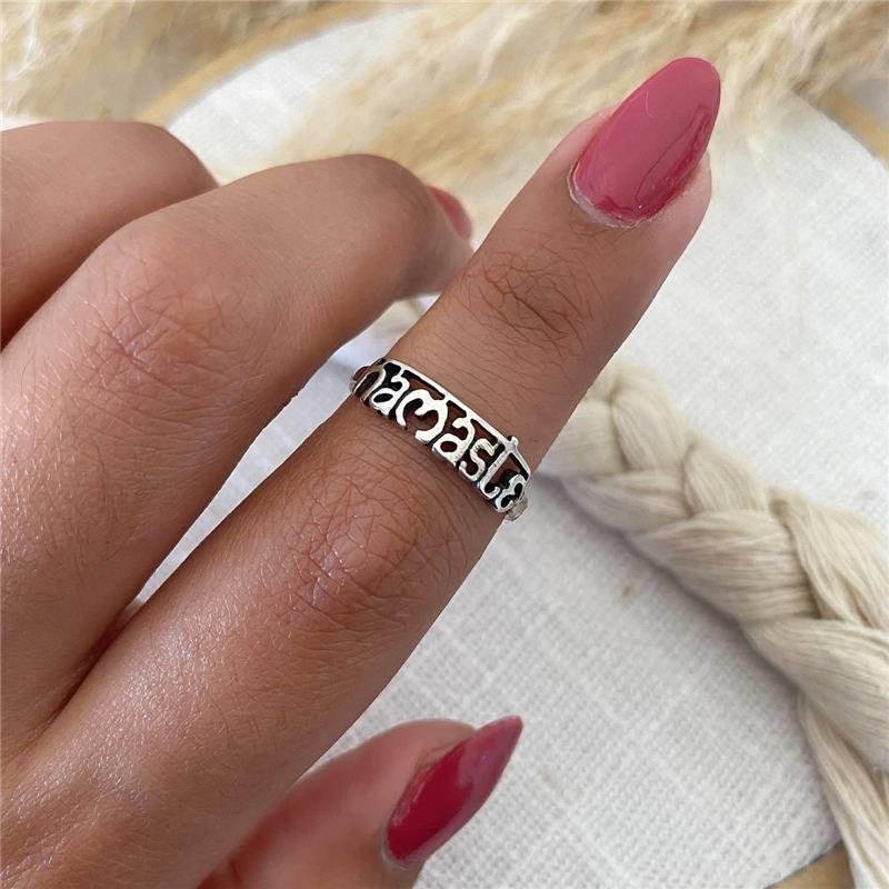 Anel Prata 925 legítima em bali. Escrita da palavra namastê em fonte especial.Medidas