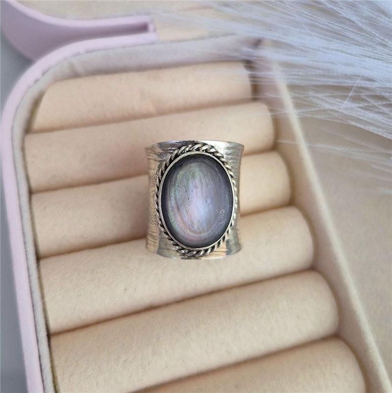Anel Prata 925 em bali. Escudo largo trabalhado em bali com pedra abalone fosca.Medidas: