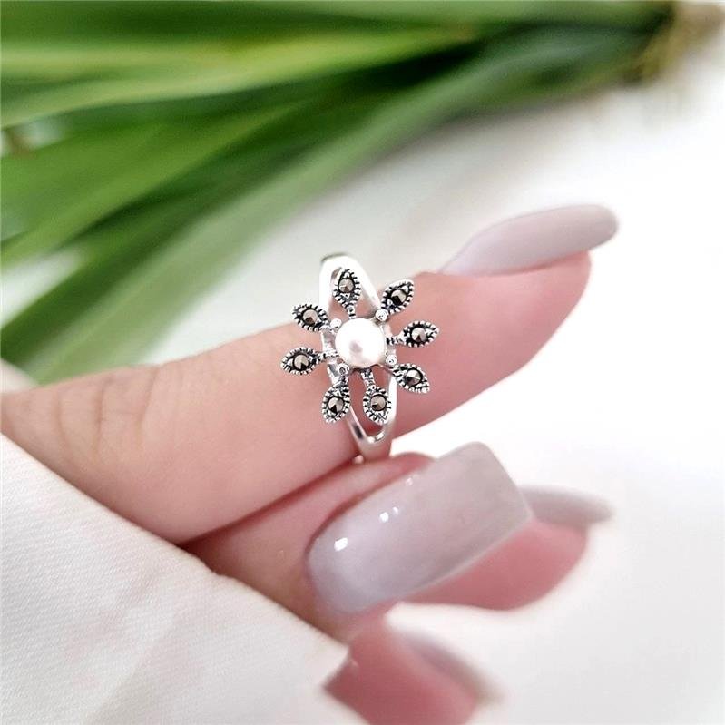 Anel Prata 925 legítima em bali. Miolo com Pérola e oito pétalas pequenas cravejadas com pedra marcassita.Medidas