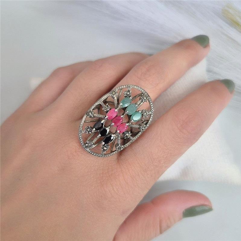 Anel prata 925 em bali. Oval cravejado com marcassitas e pedras naturais: Onix, Rubi e Esmeralda.Medidas:
