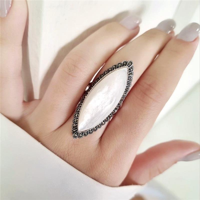 Anel Prata 925 legítima em bali. Pedra Natural Madre Pérola formato navete, laterais trabalhadas como pequenas pétalas cravejadas com pedra marcassita.Medidas