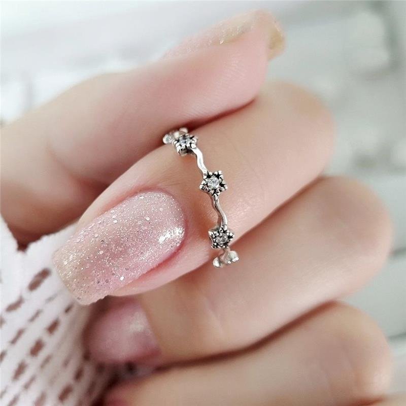 Anel Prata 925 legítima em bali. Parte superior do aro ondulada com cinco flores com pétalas pontiagudas e miolo cravejado com pedra zircônia.Medidas