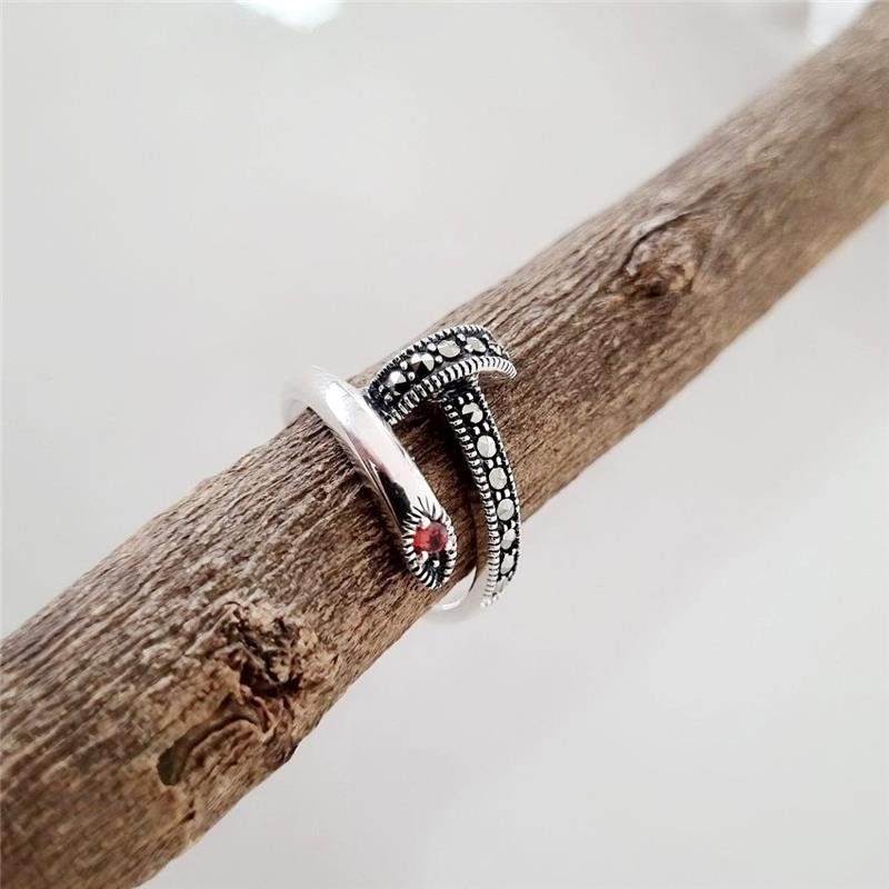 Anel Prata 925 legítima em bali. Prego torcido envolvendo o dedo, com cabeça cravejada em pedra marcassita, e ponta cravejada com uma pedra de zircônia vermelha.Medidas