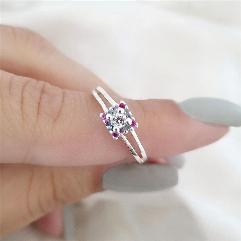 Anel Prata 925 legítima. Solitário com aro dividido na parte superior, pedra redonda em zircônia tradicional cravejado ao entorno formando um quadrado de pedras coloridas em zircônia nas cores pink, lilás e verde água.Medidas