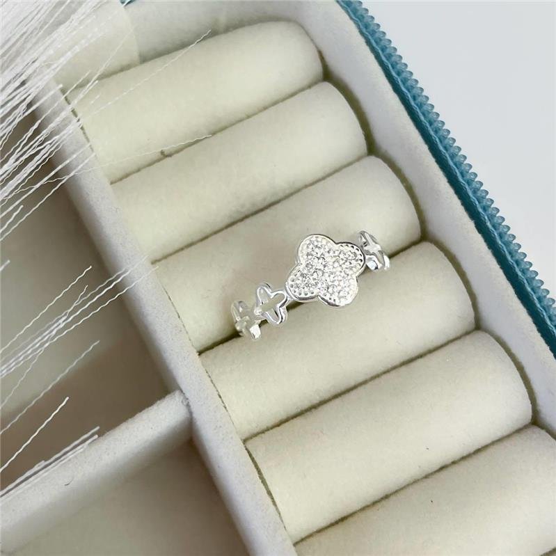 Anel Prata 925 Trevo central trabalhado e cravejado com microzircônias e quatro trevos menores vazados nas laterais.Medidas: