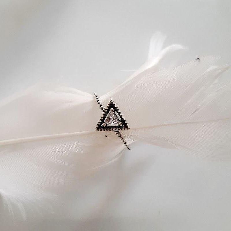 Anel Prata 925 legítima em bali. Formato triângulo vazado com zircônia no centro em forma de triângulo e na borda do triângulo e do aro trabalhado com riscos.Medidas: