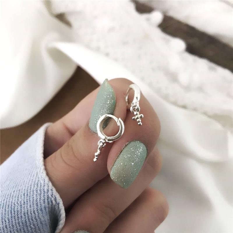 Brinco Prata 925 legítima. Argola abaulada com pingente pendurado de cruz formada por bolinhas. Fecho click.Medidas