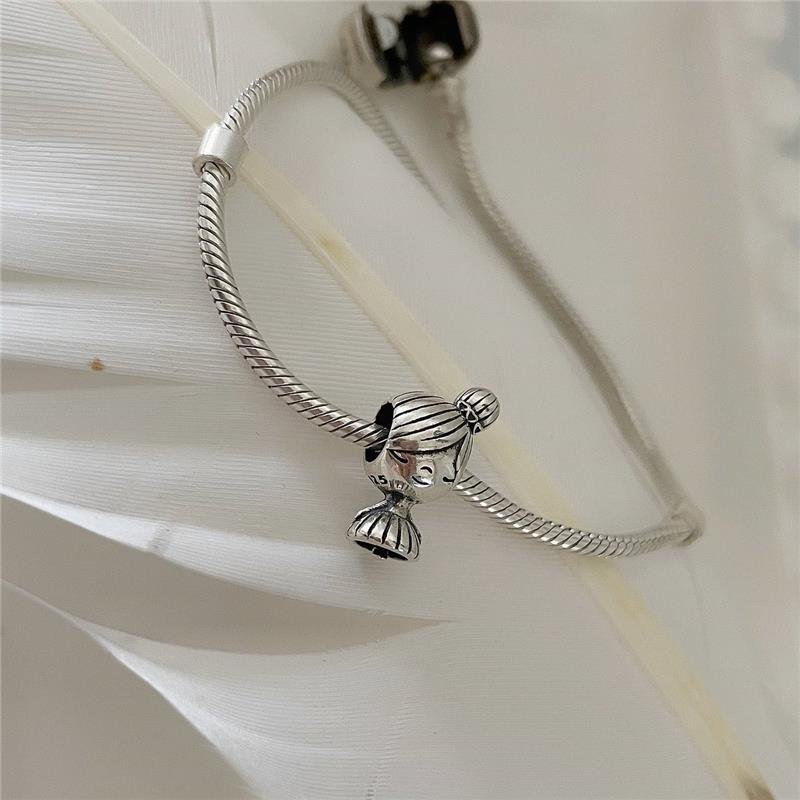 Berloque na prata bali menina de vestido rodado com coque de lado e amarrador de coraçõezinhos, olhos fechados. Confeccionado em Prata 925.Medidas: