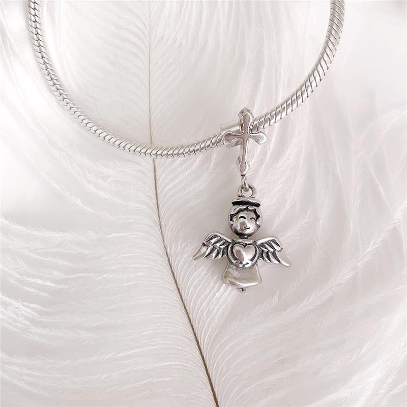 Berloque na prata bali anjinho pendurado com asas e segurando um coração. Base do berloque em formato de cruz. Confeccionado em Prata 925.