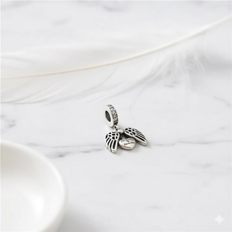 Berloque Prata 925 legitima em bali. Asa trabalhada em detalhes vazados. Atras um coração pendurado escrito ¨forever & family¨. Berloque pendurado com base redondada cravejado com pedra zircônia tradicional. Compatível com pulseiras Vivara e Pandora.Medidas:
