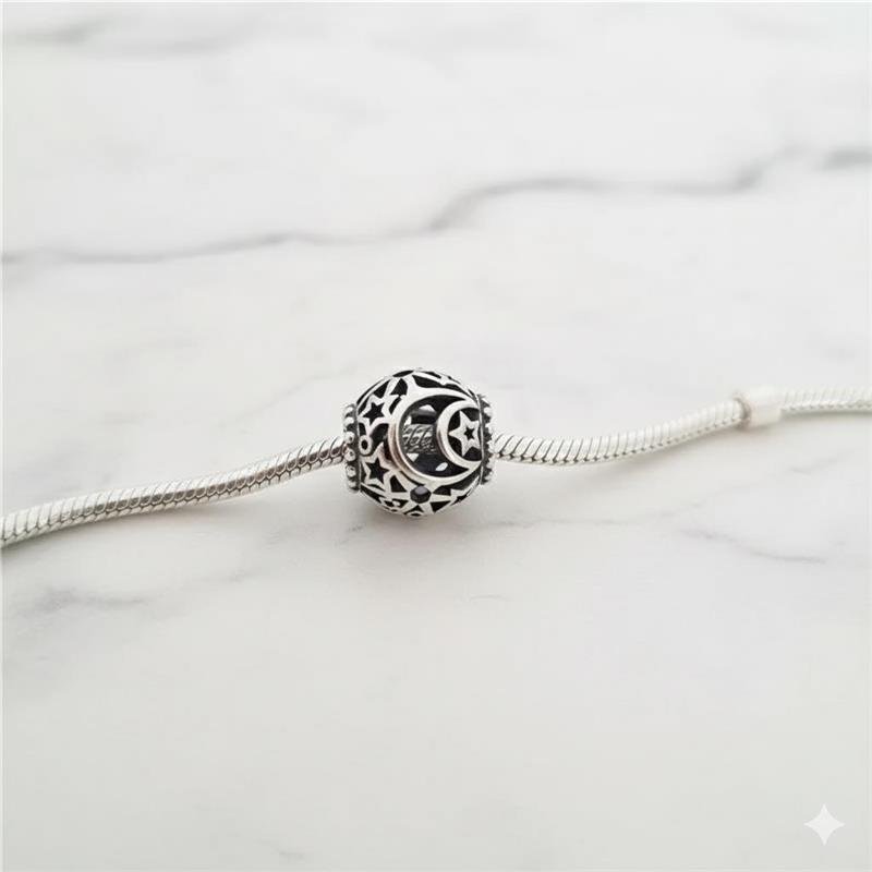 Berloque Prata 925 legítima em bali. Murano em formato de bola com tema céu luas, estrelas, sol e bolinhas vazadas. Lateral trabalahda com bolinhas em todo contorno da entrada da pulseira. Compatível com pulseiras Vivara e Pandora.