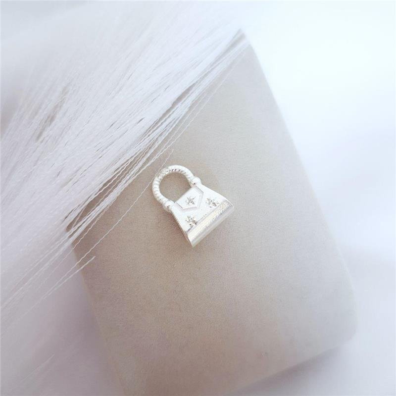 Berloque em prata 925 formato de bolsa, trabalhada e cravejada com microzircônias.Medidas: