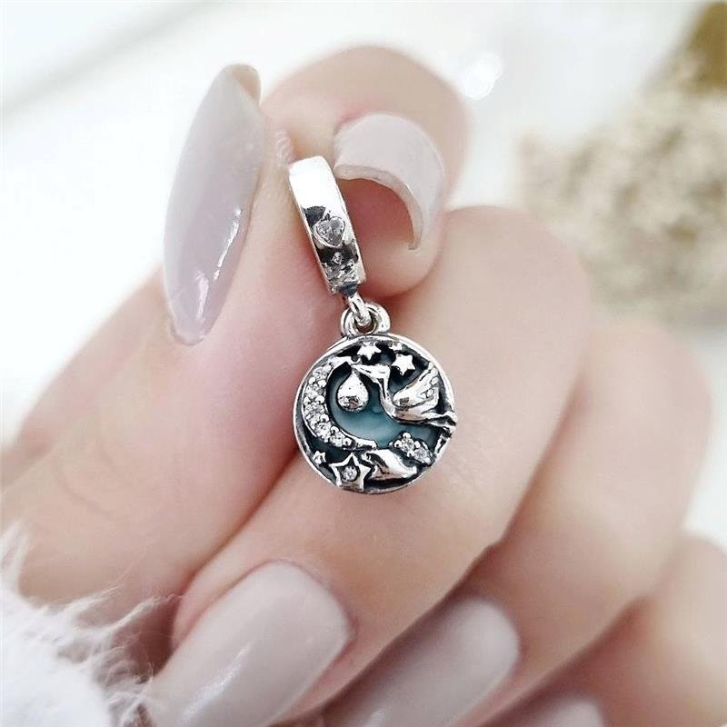 Berloque Prata 925 legítima em bali. Dois pingente redondo, um de cegonha no céu da noite, lua e alguma estrelas cravejadas, outro pingente com uma face em resina azul perolada e outra com frase "twinkle twinkle little star do you bnow how loved you are?" tradução "Brilha brilha estrelinha, você sabe o quanto é amada?". Base do pingente em forma de pin de localização com cravejado em formato de coração. Compatível com pulseira Vivara e Pandora.Medidas