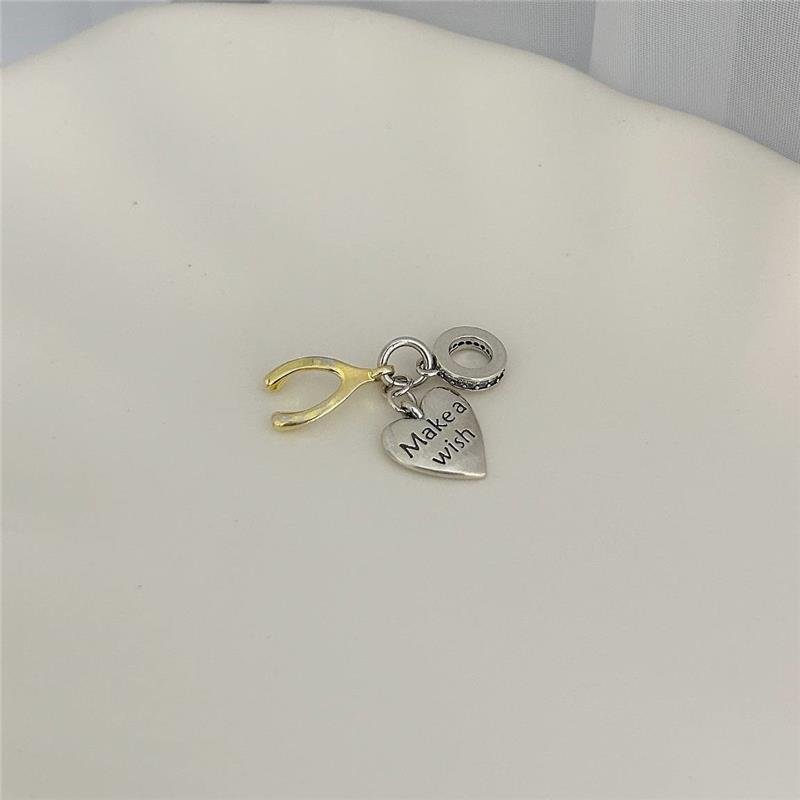 Berloque Prata 925 coração escrito: "Make a Wish" e uma fúrcula (ossinho da sorte) em dourado.Medidas: