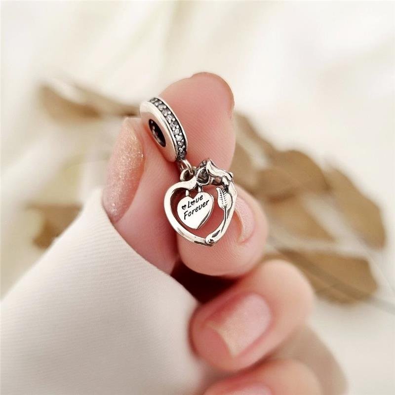Berloque Prata 925 Legitima em Bali. Coração vazado trabalhado com rosa e caule na lateral do coração, e no centro pendurado um coração liso com escrita ¨Love Forever¨ que significa "amor para sempre". Pendurado em base cravejada com pedra zircônia. Compatível com pulseira Vivara e Pandora.Medidas: