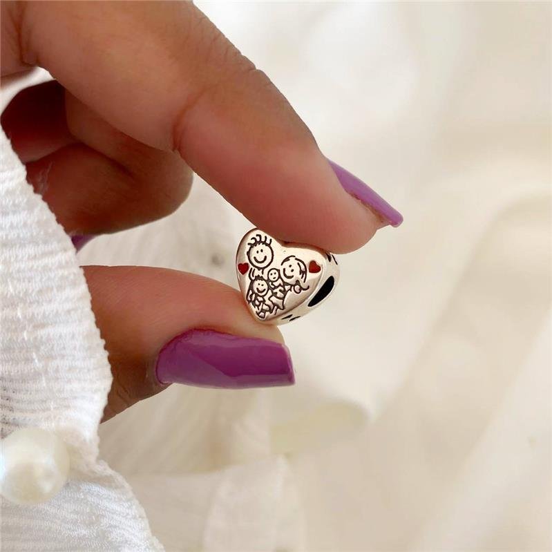 Berloque Prata 925 legítima em bali. Murano formato coração quadrado com desenho de família com uma criança e um bebê em baixo relevo escurecido e dois corações nas laterais resinados em vermelho.Medidas