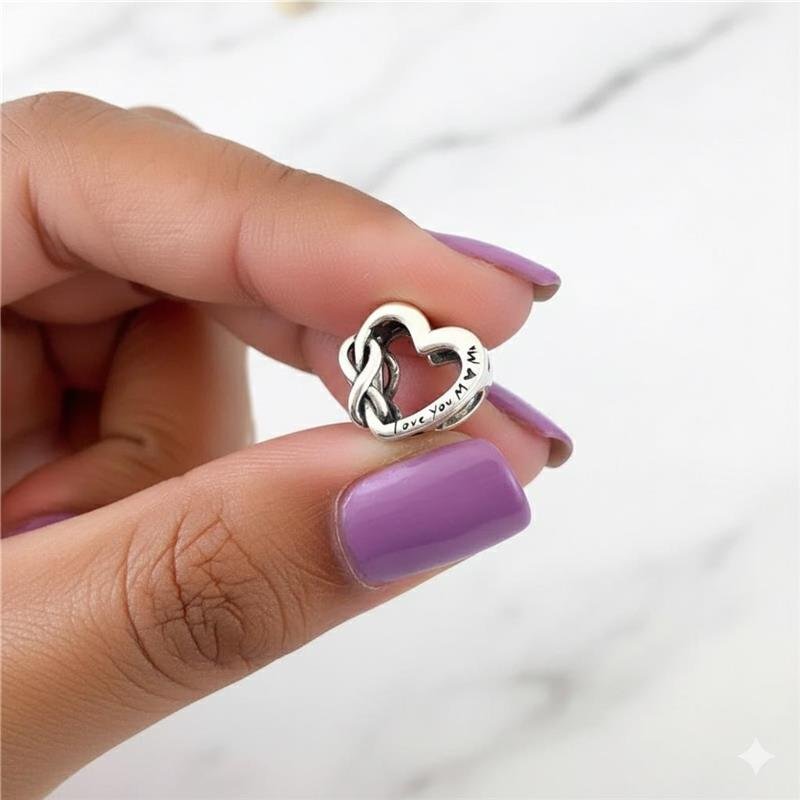 Berloque Prata 925 legítima em bali. Murano de coraçã vazado com infinito entrelaçado em uma borda do coração e do outo lado escrita em baixo relevo escurecido 'Love You MOM' em inglês que significa 'Amo você mãe'. Duas faces do corção iguais. Laterais do murano vazadas em formato de coração.Medidas