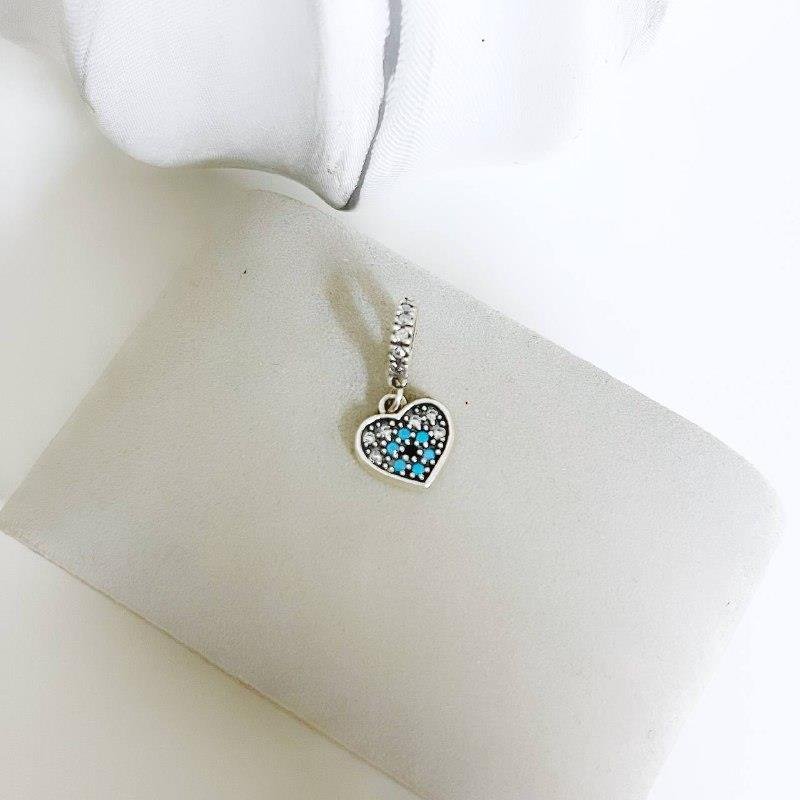 Berloque prata 926. Coração cravejado com olho grego em azul. Base berloque cravejada.