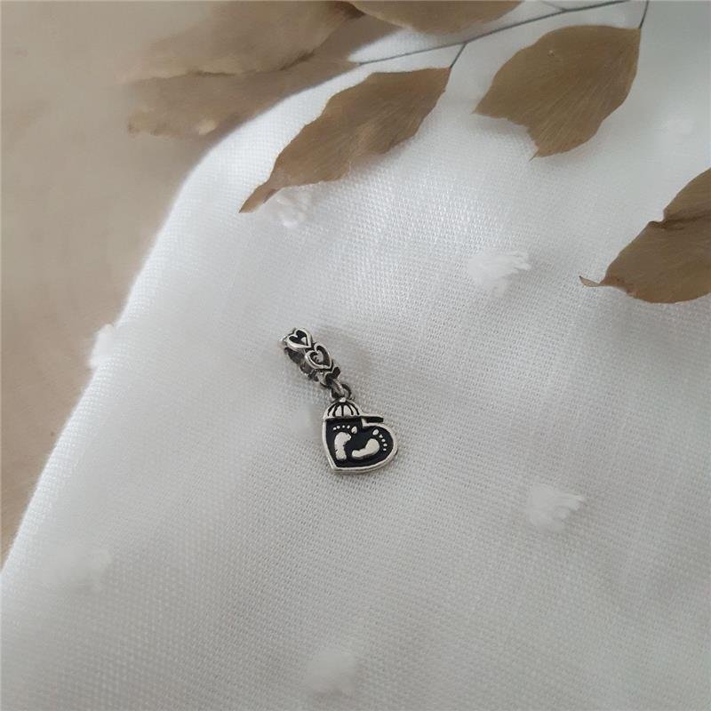 Berloque Prata 925 em Bali. Coração preto pendurado, com pezinhos e boné na lateral, filho bebê menino. Base do berloque trabalhada com corações vazados unidos.Medidas:
