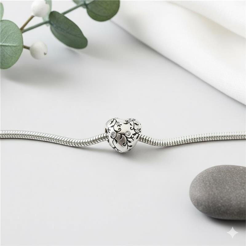 Berloque Prata 925 legítima em bali. Murano de coração aredondado com detalhes de ramos com folhagens em baixo relevo escurecido por toda a peças com alguns detalhes cravejados em pedra zircônia nos ramos.Medidas
