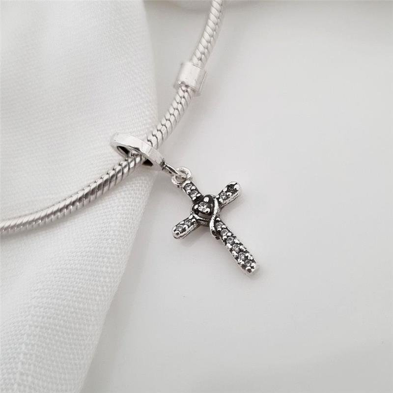 Berloque Prata 925 legítima. Cruz toda cravejada em pedra zircônia com coração no centro também em pedra zircônia e contorno em linha lisa. Base fina.Medidas