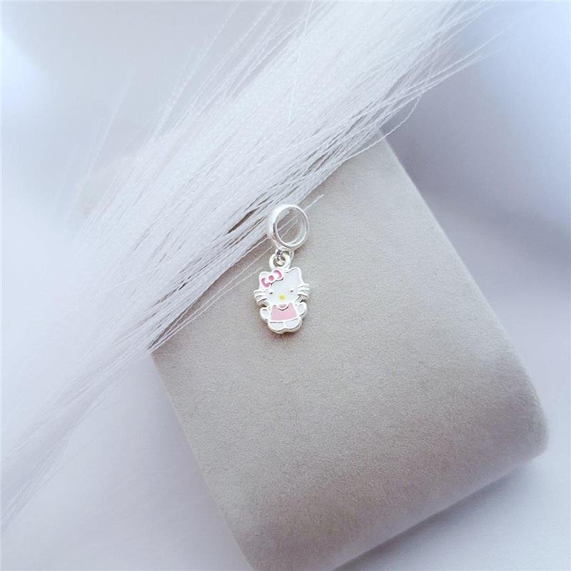 Berloque prata 925 gatinha com laço e roupa rosa em resina. Base abaulada.