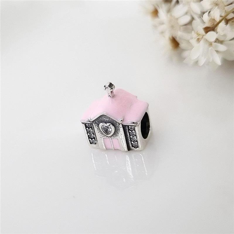 Berloque Prata 925 legítima em bali. Igrejinha com porta e teto resinado em rosa claro, cravejado nas paredes laterais e no centro em cima da porta craveja em forma de coração com pedra zircônia. Compatível com pulseira Vivara e Pandora.Medidas
