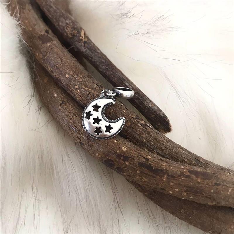 Berloque Prata 925 legítima em bali. Lua abaulada com bordas trabalhadas com bolinhas e cinco estrelas vazadas na parte interna da lua. Berloque pendurado com abaulada.Medidas