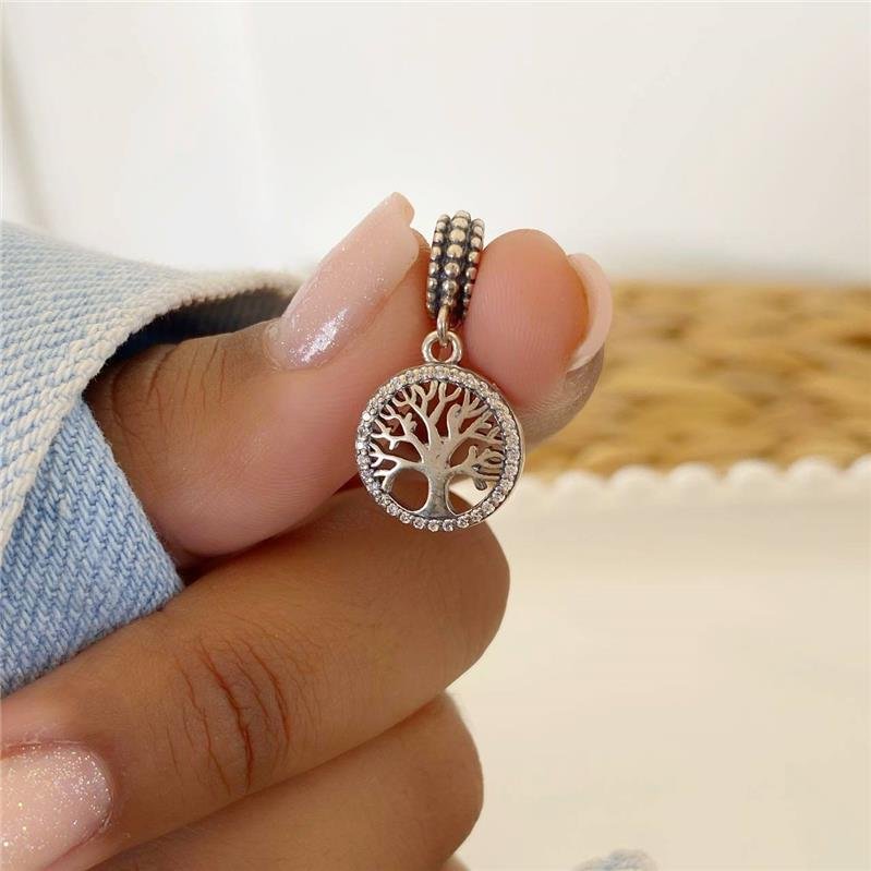 Berloque Prata 925 legítima em bali. Medalha redonda com contorno todo cravejado com pedra zircônia e no centro arvore da vida lisa com fundo vazada. Berloque pendurado com base trabalhada com três linhas de bolinhas, sendo a do meio com bolinhas um pouco maiores.Medidas