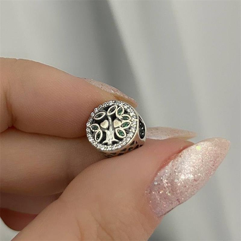 Berloque Prata 925 legítima em bali. Murano redondo com árvore da vida, fundo vazado e folhas cravejadas com micro zircônias verdes, e zircônias brancas ao seu redor. Lateral vazada varios buraquinhos em formato de pequenos corações.Medidas