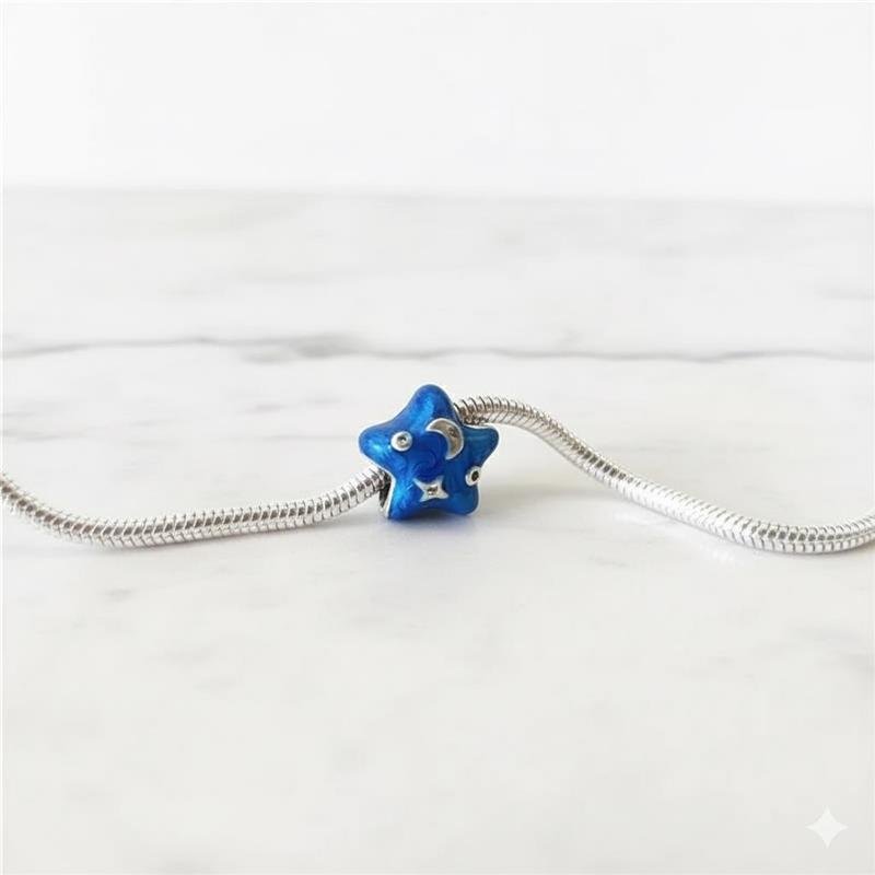 Berloque Prata 925 legitima em bali. Murano estrela com resina azul. Trabalhada com desenhos de lua e estrelas em ambos os lados, estes desenhos tem a pedra zircônia no meio. Compatível em pulseiras Vivara e Pandora.Medidas: