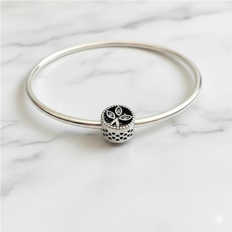 Berloque Prata 925 legítima em bali. Murano redondo com bordas trabalhadas com bolinhas, no centro raminhos com folhas cravejadas com pedra zircônia e fundo vazado. Lateral vazada com quatro fileiras de coraçõezinhos. Compatível em pulseiras Vivara e Pandora.Medidas