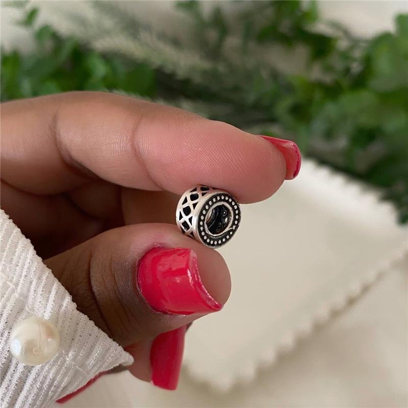 Berloque Prata 925 legítima em bali. Separador de berloque estilo rodinha, semelhante a um tambor, com trabalhado em linhas formando losangos vazados e lateral trabalhado com pequenas bolinhas e fundo escurecido.