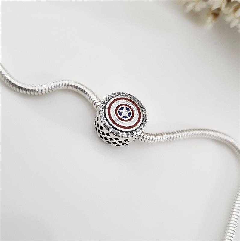 Berloque Prata 925 legítima em bali. Murano redondo com borda dos dois lados cravejados em pedra zircônia, um lado com escudo do Capitão América colorido em resina e do outro escrito Capitão América em inglês . Compatível com pulseira Vivara e Pandora.Medidas