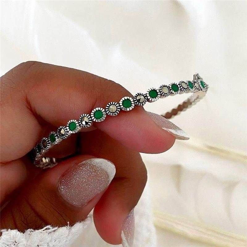 Bracelete prata 925 legítima em bali. Bracelete redondo, formado por pequenos círculos dos mesmo tamanhos ligados, crevajados por pedra natural de Safira ou Esmeralda, intercalado por marcassitas. Fecho com trava de encaixe.Medidas