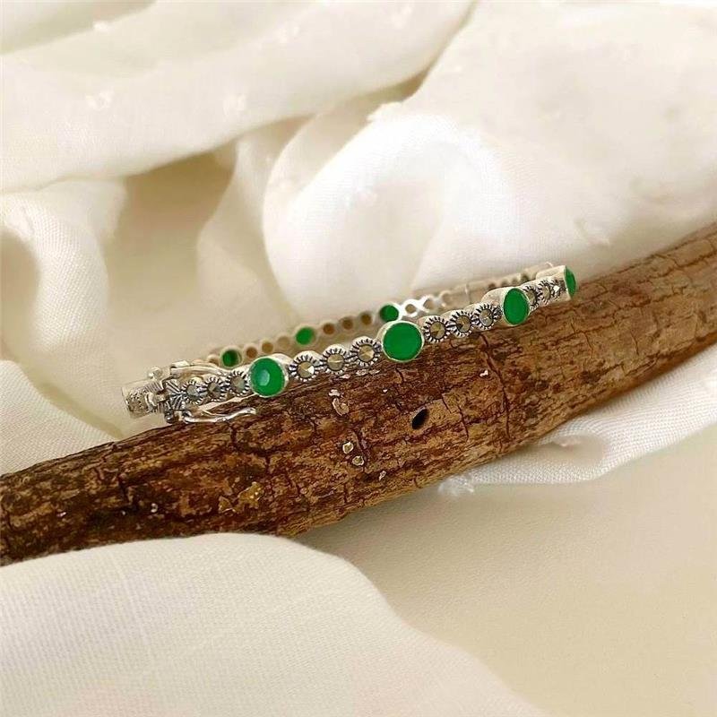 Bracelete prata 925 legítima em bali. Bracelete redondo, formado por pequenos círculos ligados, cravejados por pedra natural de Safira ou Esmeralda nos círculos maiores, intercalado por três círculos menores com marcassitas. Fecho com trava de encaixe.Medidas