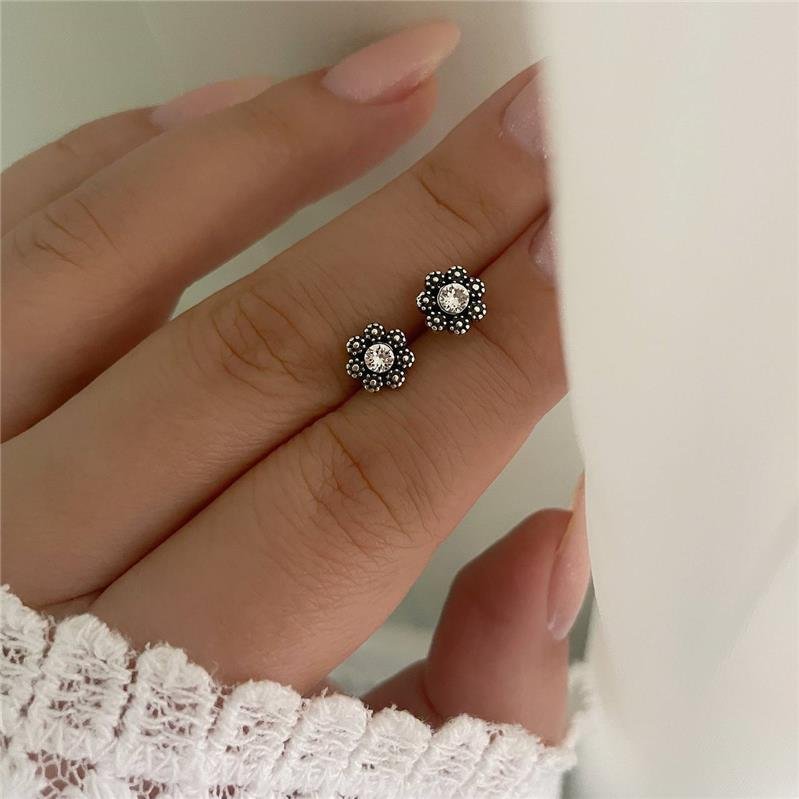 Brinco de florzinha prata bali com zircônia no meio e detalhes em bolinhas. Brinco com tarracha. Pino no meio. Confeccionado em Prata 925.Medidas: