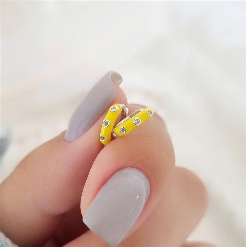 Brinco Prata 925 legítima. Argola com parte da frente resinada em amarelo cravejado com três pedra zircônia. Fecho encaixeMedidas