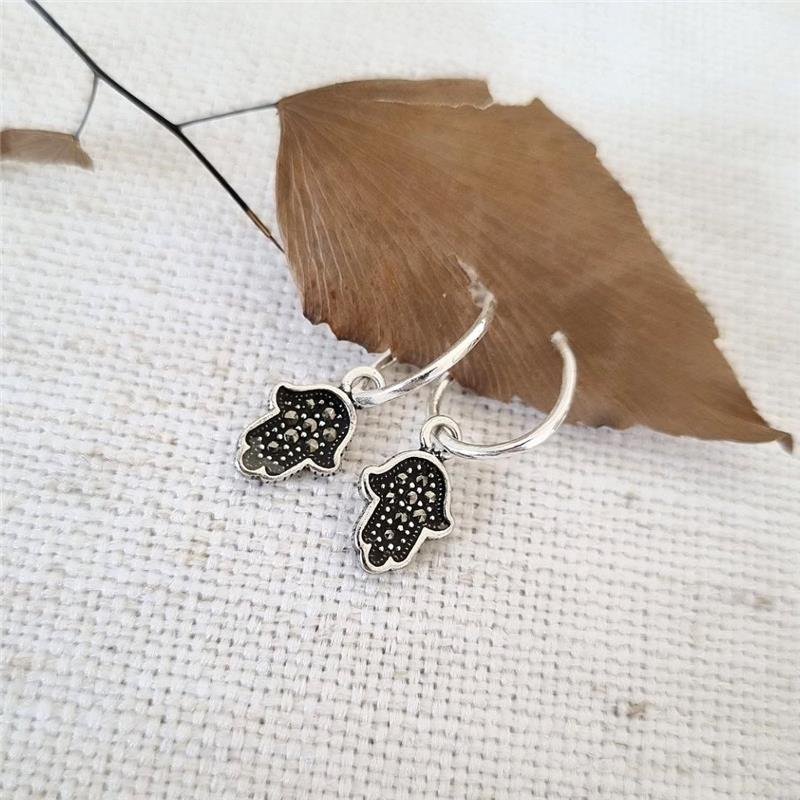Brinco Prata 925 legítima em bali. Argola com pingente pendurado de mão de fátima, borda pontilhada, fundo escurecido e cravejado com pedra marcassita. Meia argola com fecho tarracha.Medidas