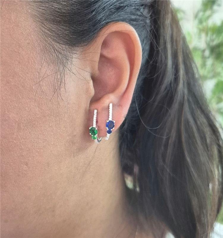 Argola Prata 925 legítima em Fotmato de J cravejado com microzirconias e 2 variações de zirconia: Azul e Verde. Brinco com tarracha.Medidas:
