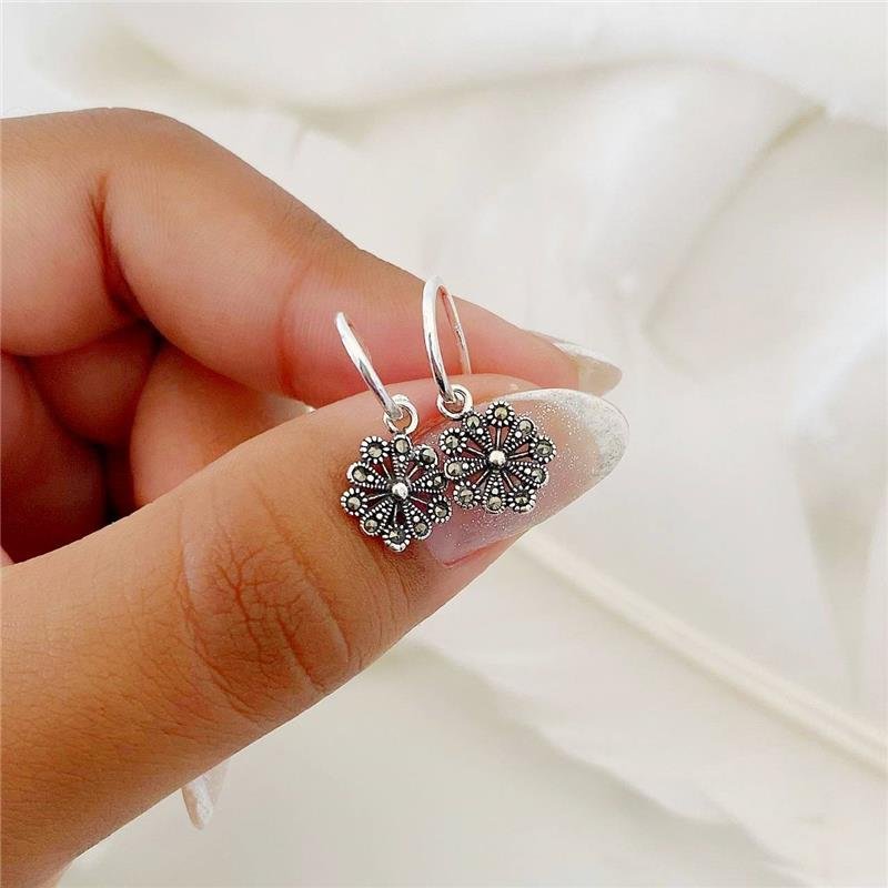 Brinco Prata 925 Legitima em Bali. Argola com flor margarida pendurada na prata bali cravejada com pedra marcassita. Base da argola redonda e lisa, fecho de encaixeMedidas:
