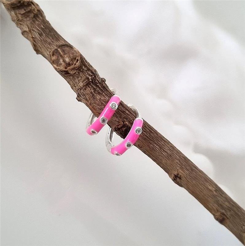 Brinco Prata 925 legítima. Argola com parte da frente resinada em cor de rosa cravejado com três pedra zircônia. Fecho encaixeMedidas