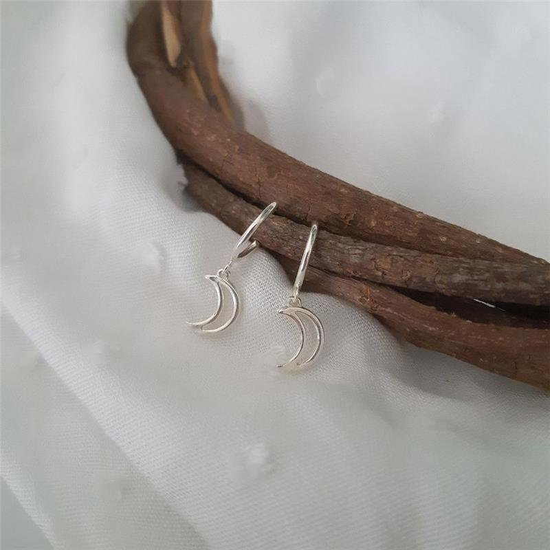 Brinco Prata 925 legítima em prata branca. Meia argolinha lisa com lua vazada penduradas. Brinco com tarracha.Medidas:
