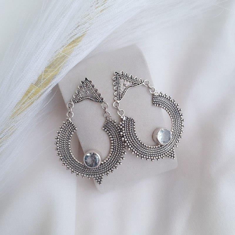 Brinco Prata 925 Bali arredondado com cristal azul claro, detalhe das linhas: corda e rococo e base triângulo.Medidas: