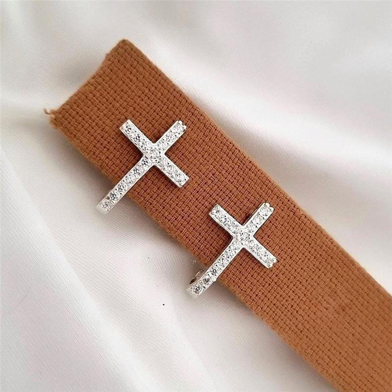 Brinco Prata 925 legítima. Cruz com face toda cravejada em pedra zircônia e parte de baixo fazendo curva para trás em forma de J. Fecho tarracha com pino localizado na parte superior da peça.Medidas